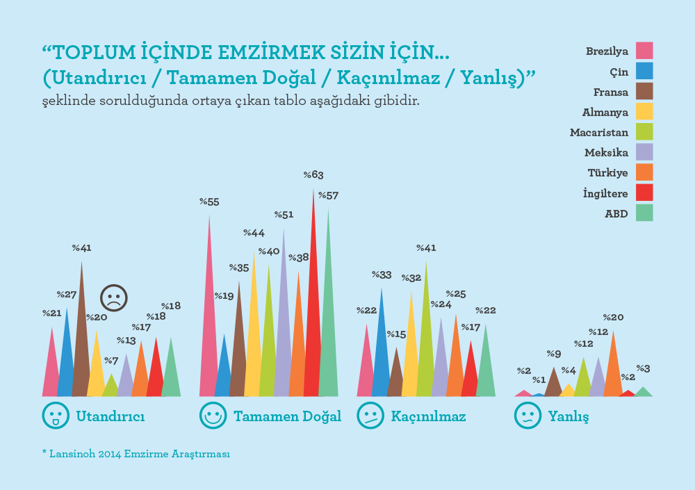 Bir başka çarpıcı sonuç ise, en uzun emzirme sürelerinden birinin Türkiye’de olmasına rağmen ‘Toplum içinde emzirmek sizin için utandırıcı/tamamen doğal/kaçınılmaz/yanlış’ sorusuna ‘yanlış’ yanıtını en fazla veren ülkenin yine Türkiye olmasıydı.